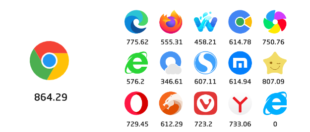 其中 Chrome 浏览器更是以 864.29 分傲视群雄,就连微软的 Edge 浏览器也无法匹敌。